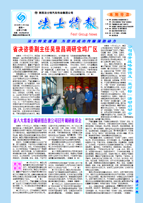 點擊量:3306●11月6日上午,吉林省科技廳副廳長謝景武一行前來我公司西安高新廠區調研。集團公司總經理馬旭耀向客人介紹了我公司生產經營情況與科技創新成果,并陪同參觀了公司汽車傳動工
